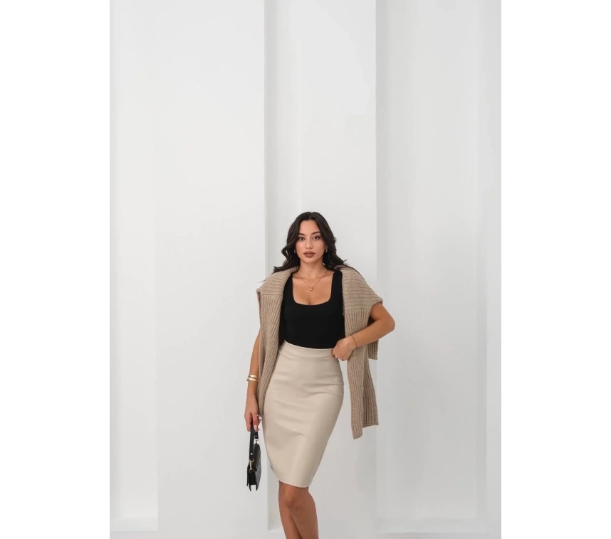 Arkadan yırtmaçlı kalem etek bej, şıklığı ve zarafeti bir arada sunar. Hem günlük kullanıma uygun hem de özel davetlerde tercih edilebilecek bir parçadır.