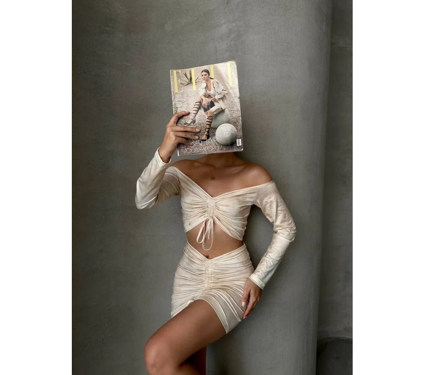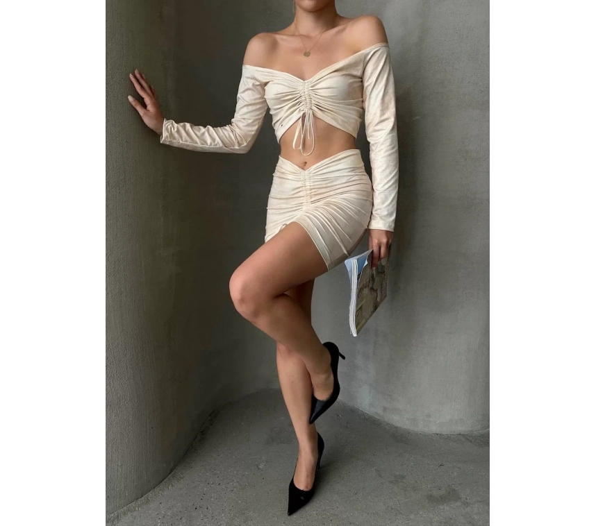 Şıklığı ve rahatlığı bir arada sunan Büzgülü Etek Bluz Takım Bej S24709, günlük hayatta şıklığı yakalamak isteyen kadınların favorisi olacak.