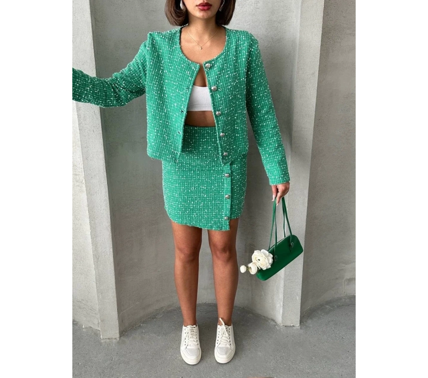 Modaya uygun ve tarz sahibi bir görünüm elde etmek isteyen kadınların tercihi olan Ceketli Etek Takım CHL Kumaş Yeşil H24443, gardırobunuzun vazgeçilmez parçalarından biri olmaya aday!