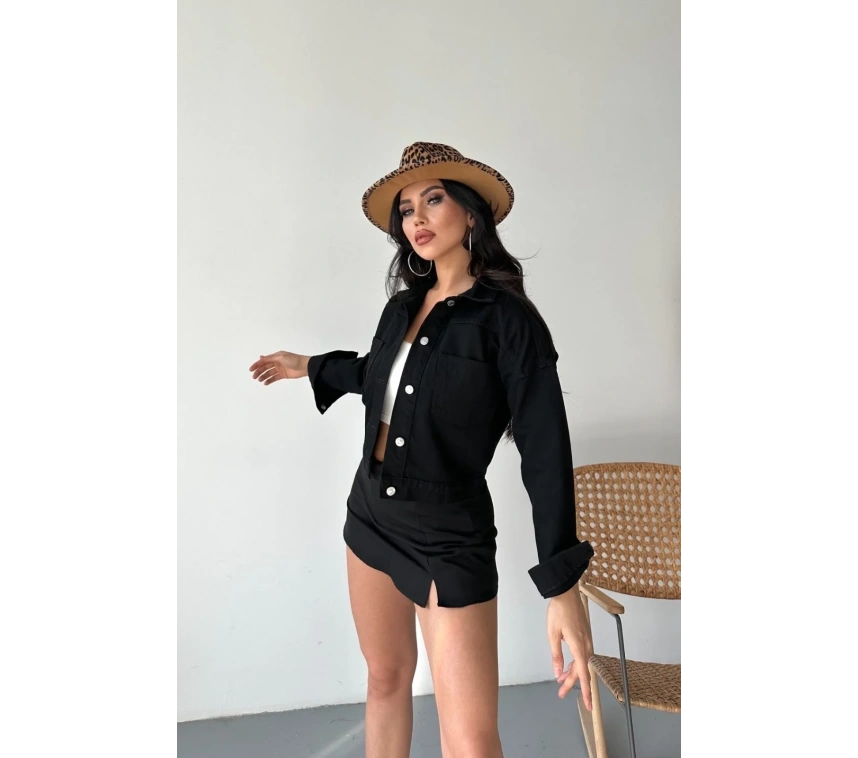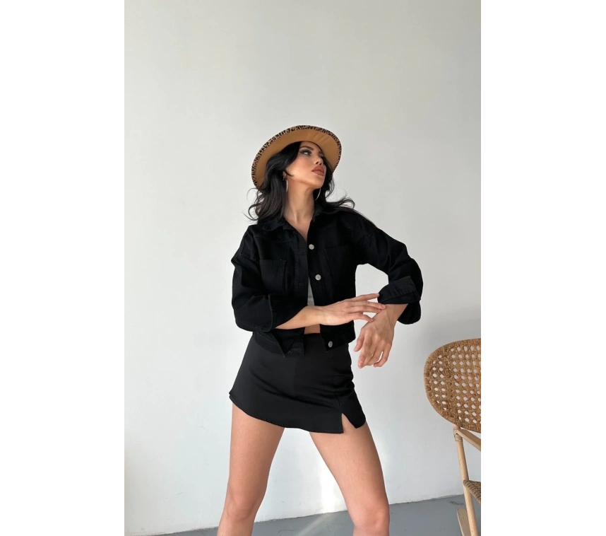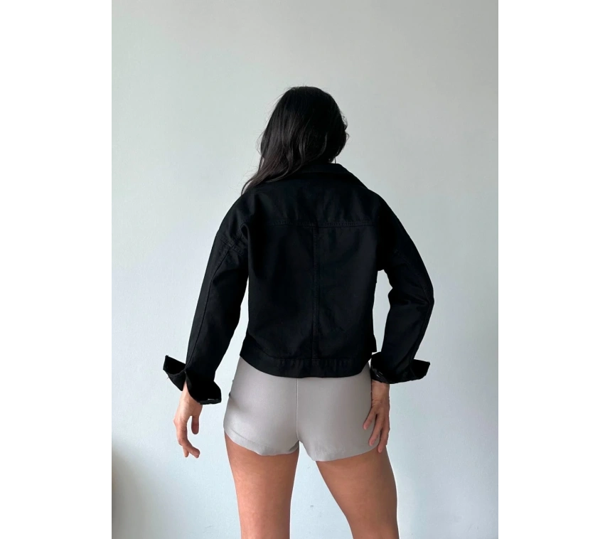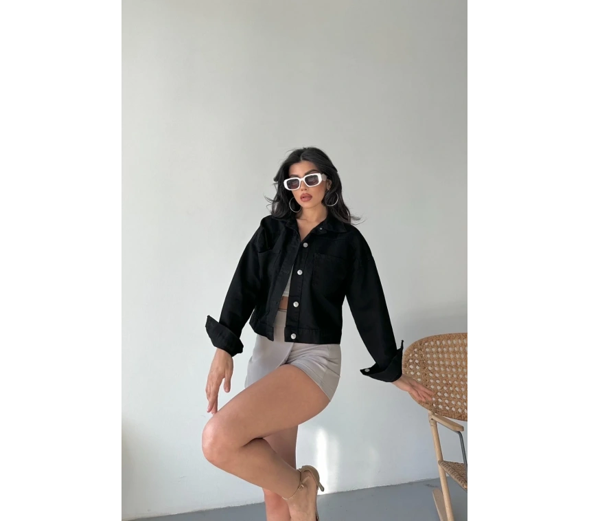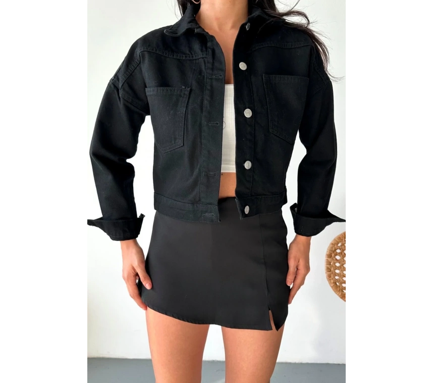 D2000 markalı çift cepli süper taş enzim yıkama crop ceket siyah, gardırobunuzun vazgeçilmezi olmaya aday!