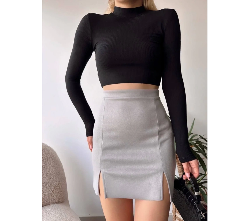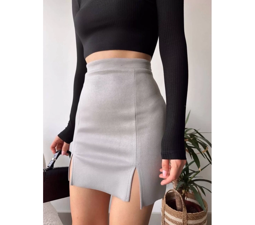 Şık ve şıklığıyla ön plana çıkan Çift yurtmaçlı süet etek gri s241002, gardırobunuzun vazgeçilmezi olmaya aday!