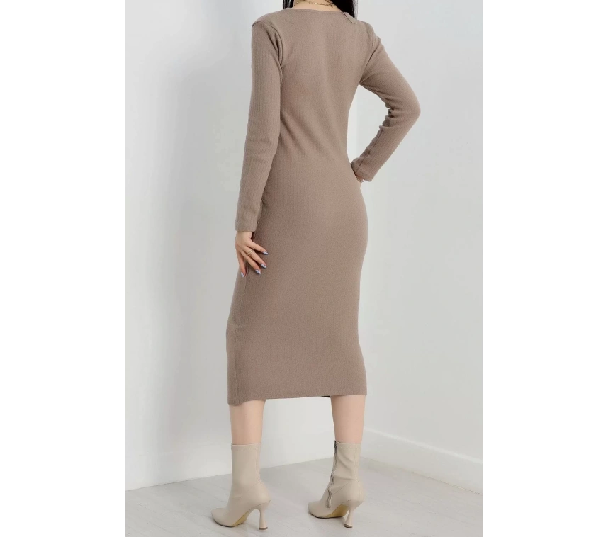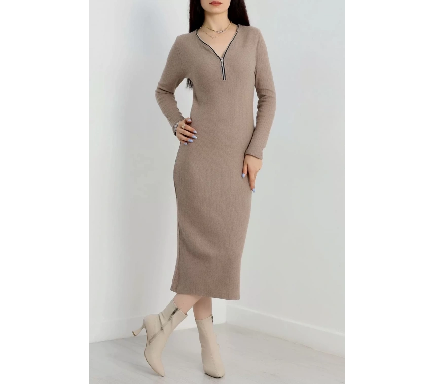 Şıklığı ve rahatlığı bir arada sunan bej renkli şardon kumaştan üretilmiş Fermuar Detaylı Fitilli Elbise, gardırobunuzun vazgeçilmezi olmaya aday.