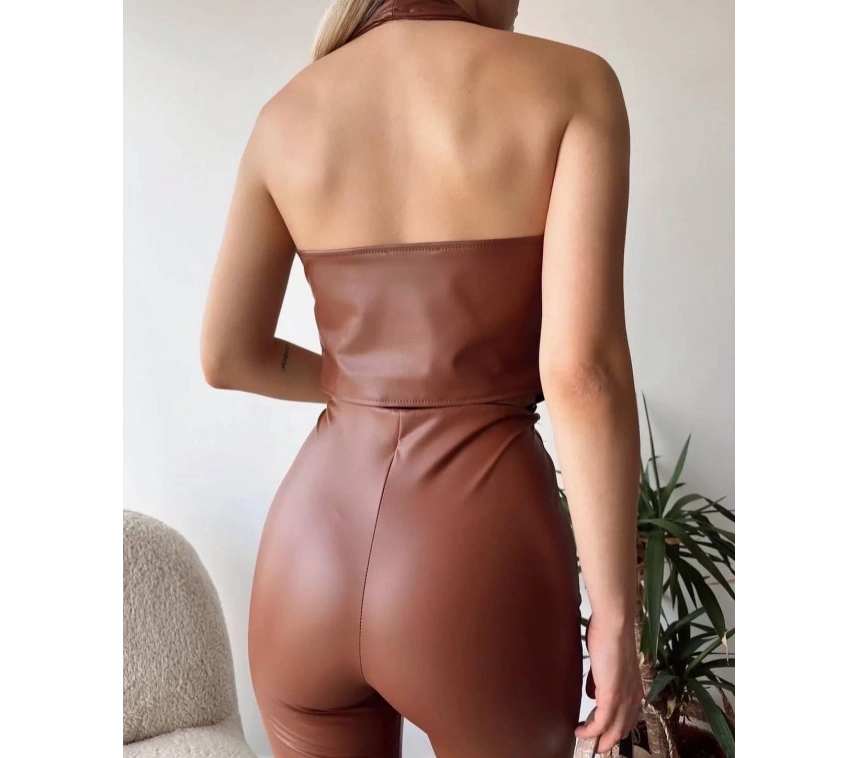 Şık ve modern tasarımıyla dikkat çeken Kahve rengi İki Düğmeli Deri Yelek, gardırobunuzun vazgeçilmezi olmaya aday!