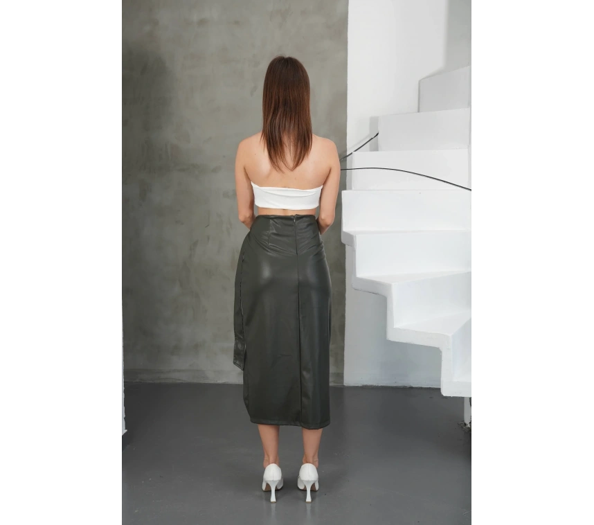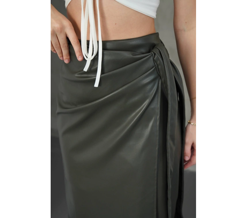 Şıklık ve rahatlığı bir arada sunan Kuşaklı Uzun Deri Etek Haki, gardırobunuzun vazgeçilmez parçalarından biri olmaya aday.