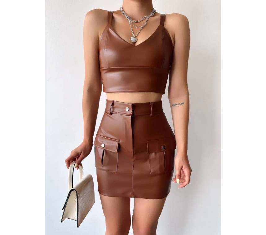 Bu özel tasarım deri etek, gardırobunuzun vazgeçilmezi olmaya aday! Şık ve şık bir görünüm sağlayan öndeki iki cepli detayı ile dikkat çekiyor.