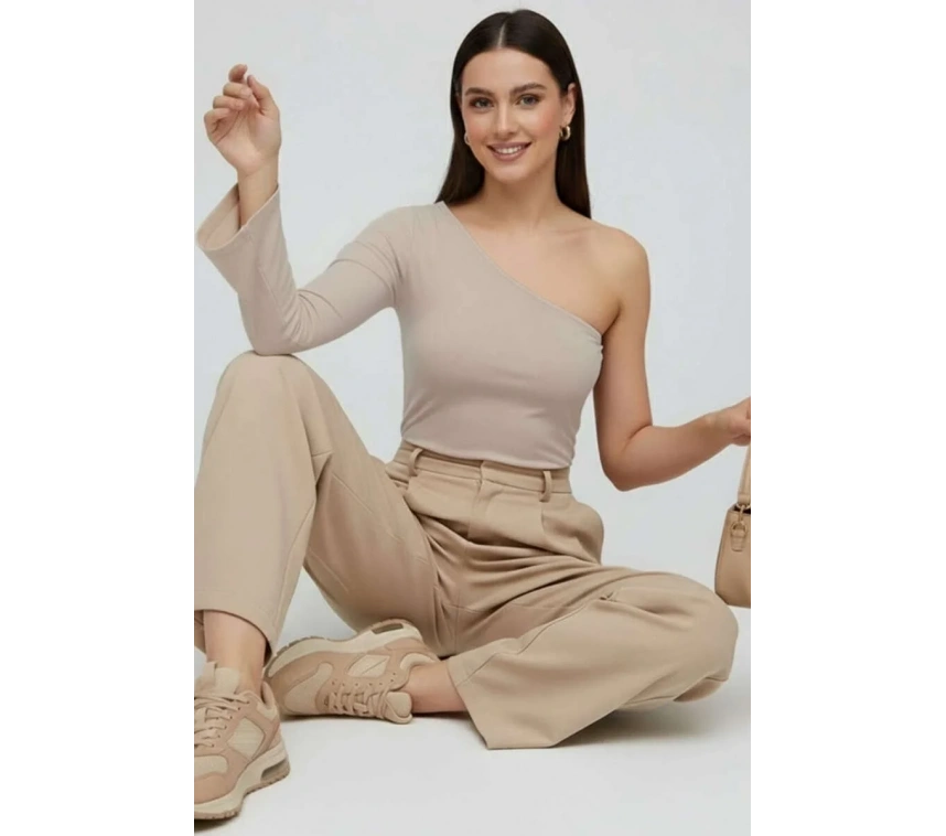 Şıklığı ve rahatlığı bir arada arayanların tercihi Tek Omuzlu Basic Bluz Vizon T4275, şimdi sizi bekliyor!