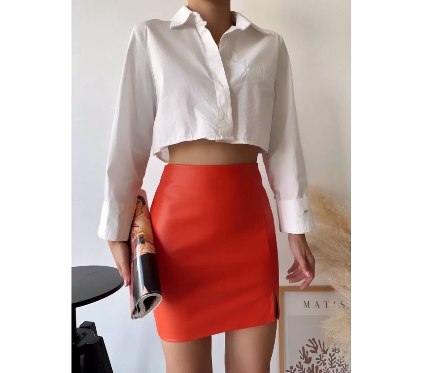 Yeni sezonun trend parçalarından olan turuncu deri etek, gardırobunuza enerjik bir dokunuş yapacak!