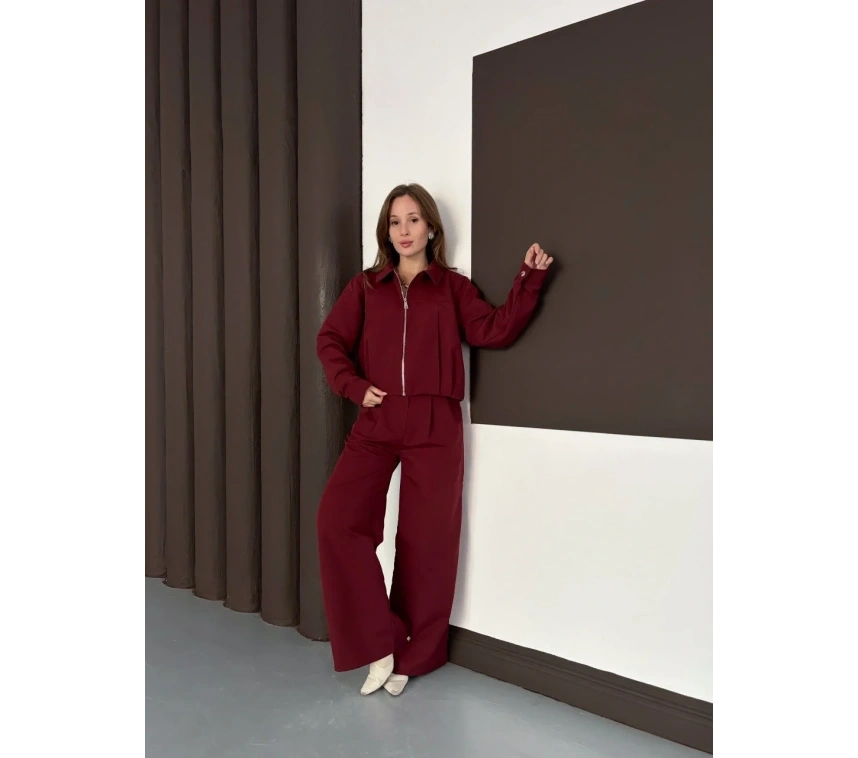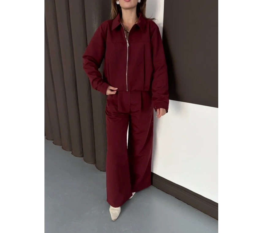 Fermuar detayıyla modern bir hava katan Trenç Takım Alt Üst Bordo Ons, kaliteli kumaşıyla da dikkat çekiyor.