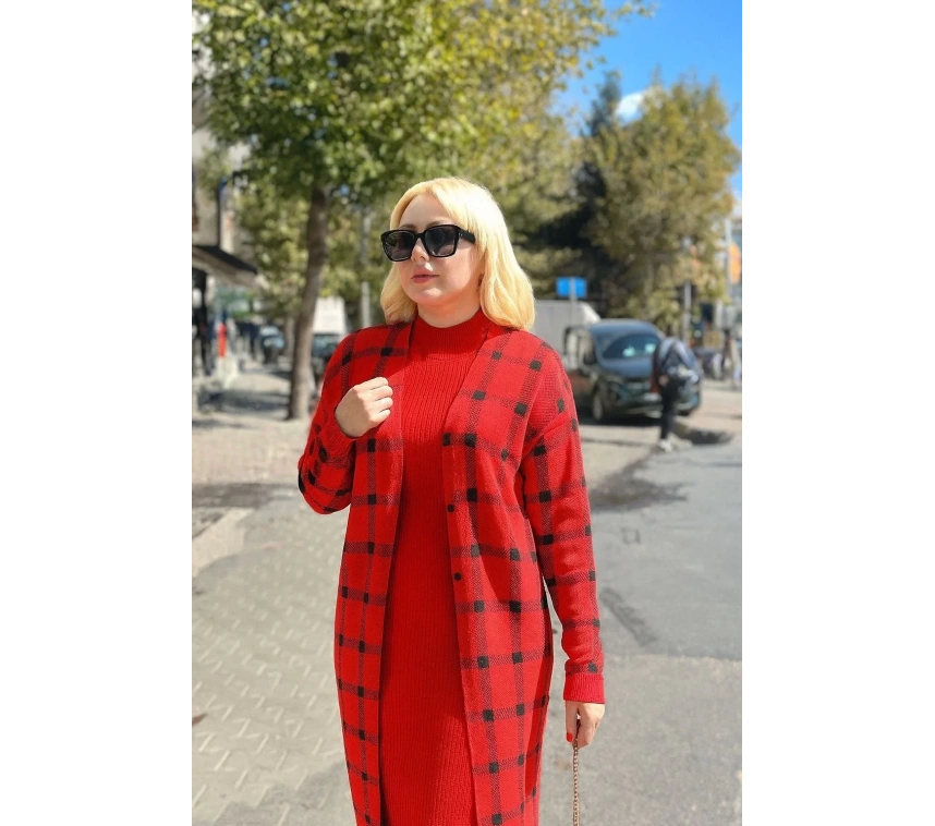 Triko Hırka elbise ikili takım kırmızı, gardırobunuzun vazgeçilmezi olmaya aday!