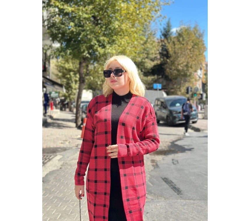Triko Hırka Elbise İkili Takım, feminen ve şık bir görünüm sunar. KırmızıSiyah renk kombinasyonuyla dikkat çeker.