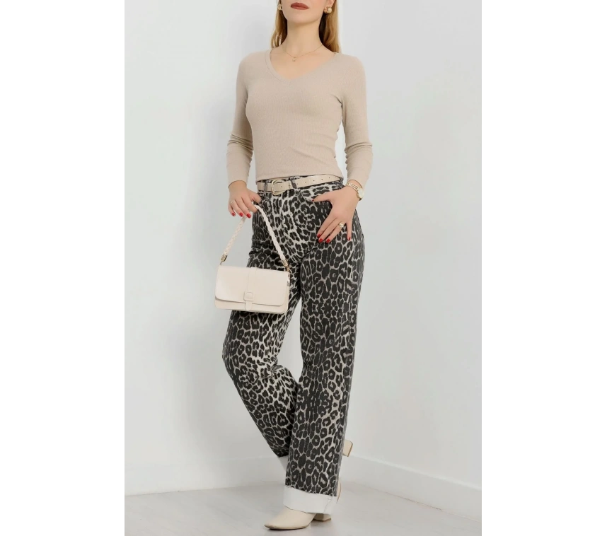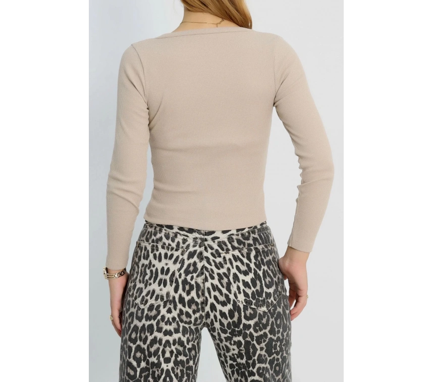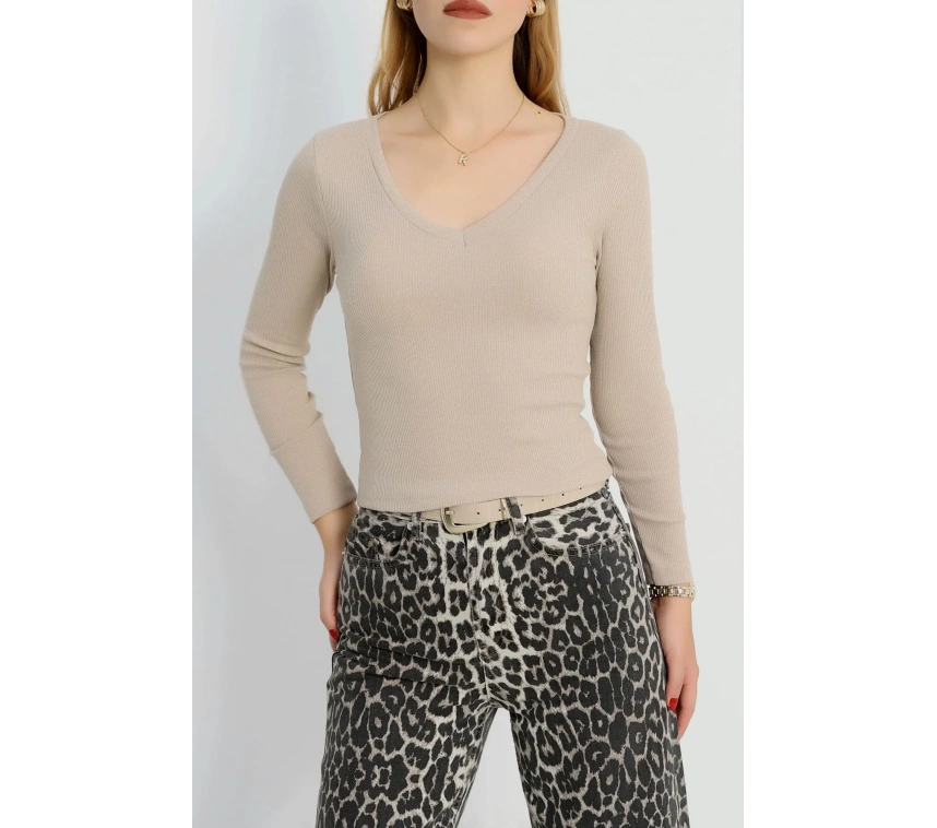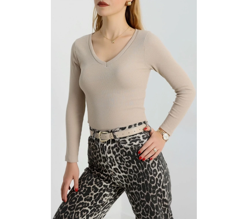 Bej renkli V yaka kaşkorse bluz Sayesinde şıklık ve tarzı bir arada sunuyor.